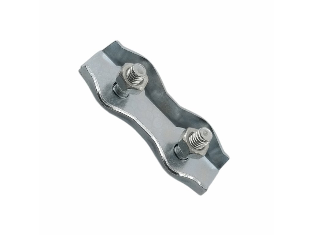 Plechová lanová svorka určená pro méně namáhané lanové spoje. Lano je k tělu svorky přitlačováno přítlačným plíškem pomocí dvou šroubů a matic.