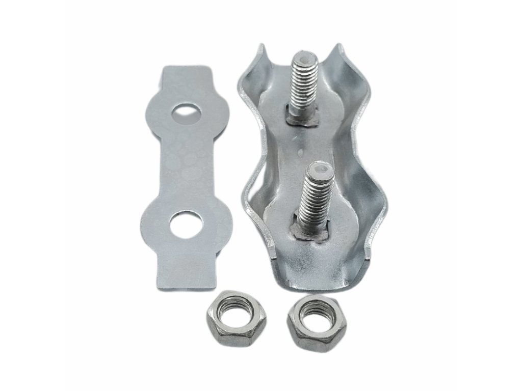 Plechová lanová svorka určená pro méně namáhané lanové spoje. Lano je k tělu svorky přitlačováno přítlačným plíškem pomocí dvou šroubů a matic.