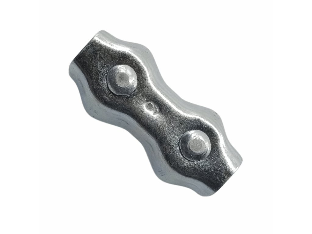 Plechová lanová svorka určená pro méně namáhané lanové spoje. Lano je k tělu svorky přitlačováno přítlačným plíškem pomocí dvou šroubů a matic.