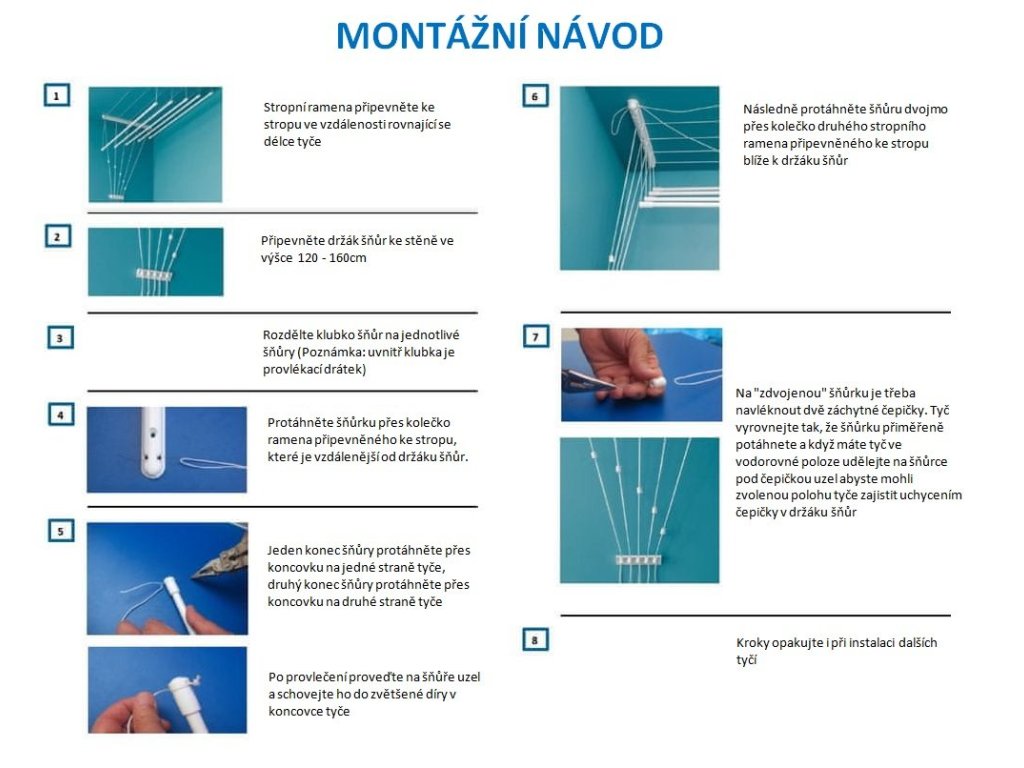 - Horní a dolní polohu tyčí stropního sušáku si můžete sami nastavit tak, aby vám při věšení a sušení prádla co nejvíce vyhovovala. Stačí snížit libovolnou tyč, pověsit prádlo a vytáhnout ho pod strop. Kulatý tvar stropních tyčí sušáku zajišťuje šetrné sušení bez poškození prádla.