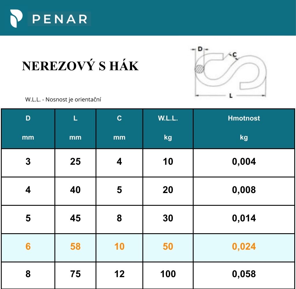 S hák nerezový 6 mm